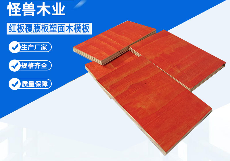 建筑模板是混凝土澆筑成形的模殼和支架,按材料的性質可分為建筑模板、建筑木膠板、覆膜板、多層板等,怪獸木業生產的混凝土紅面木模板主要適用于高層建筑中、剪力墻、垂直墻板和大壩、隧道及立交橋、拱橋等橋梁、梁柱等建筑的高層建筑專用的鐵紅面建筑模板,耐腐蝕:不污染混凝土表面。